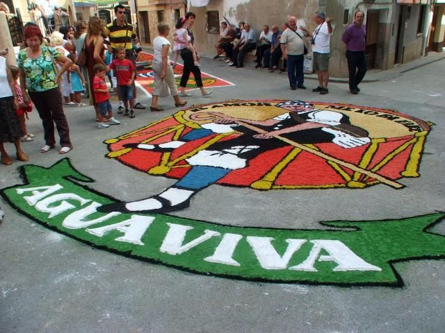 Venidas desde Aguaviva, las gentes de las Asociación Cultural Caliu comenzarán a alfombrar con serrín parte de la Plaza de los Arcos (Esta actividad ha sido declarada recientemente Fiesta de Interés Turístico de Aragón)